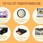 The DTF printing workflow is the end-to-end process from artwork to finished shirt. It typically includes planning artwork and color management, preparing for film printing, printing on DTF film, powder application and curing, transferring the design with a heat press, and final quality checks. Following these DTF printing steps helps ensure color fidelity, durability, and workflow efficiency.